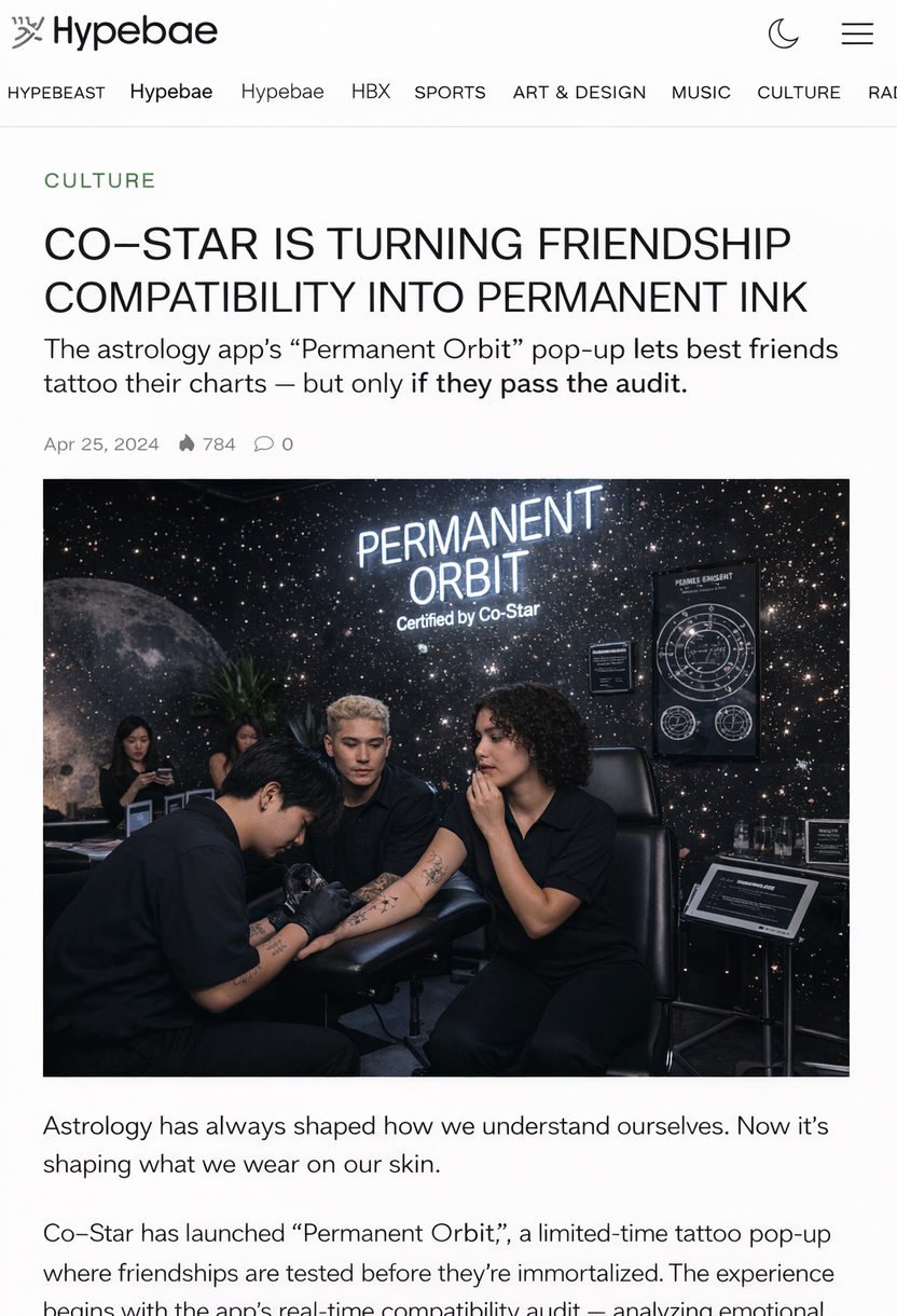 A one-week CoStar tattoo pop-up where only friends categorized as “Inner Circle” in the Friend Audit could receive a custom tattoo, generated from their merged birth charts